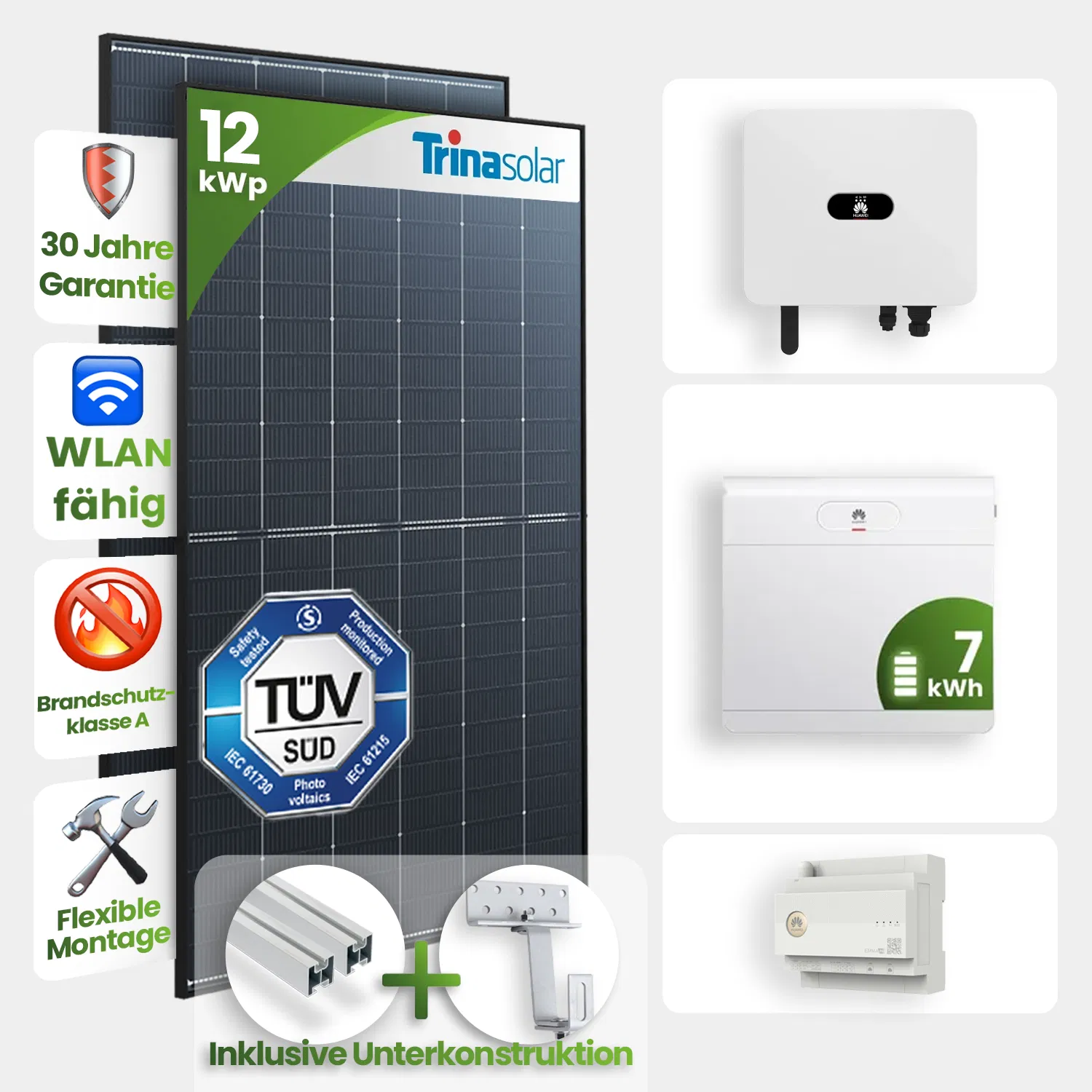 Solaranlage 12,3 kWp: Komplettset mit Huawei Hybridwechselrichter, Speicher & Trina Glas-Glas-Modulen - Schrägdachmontage