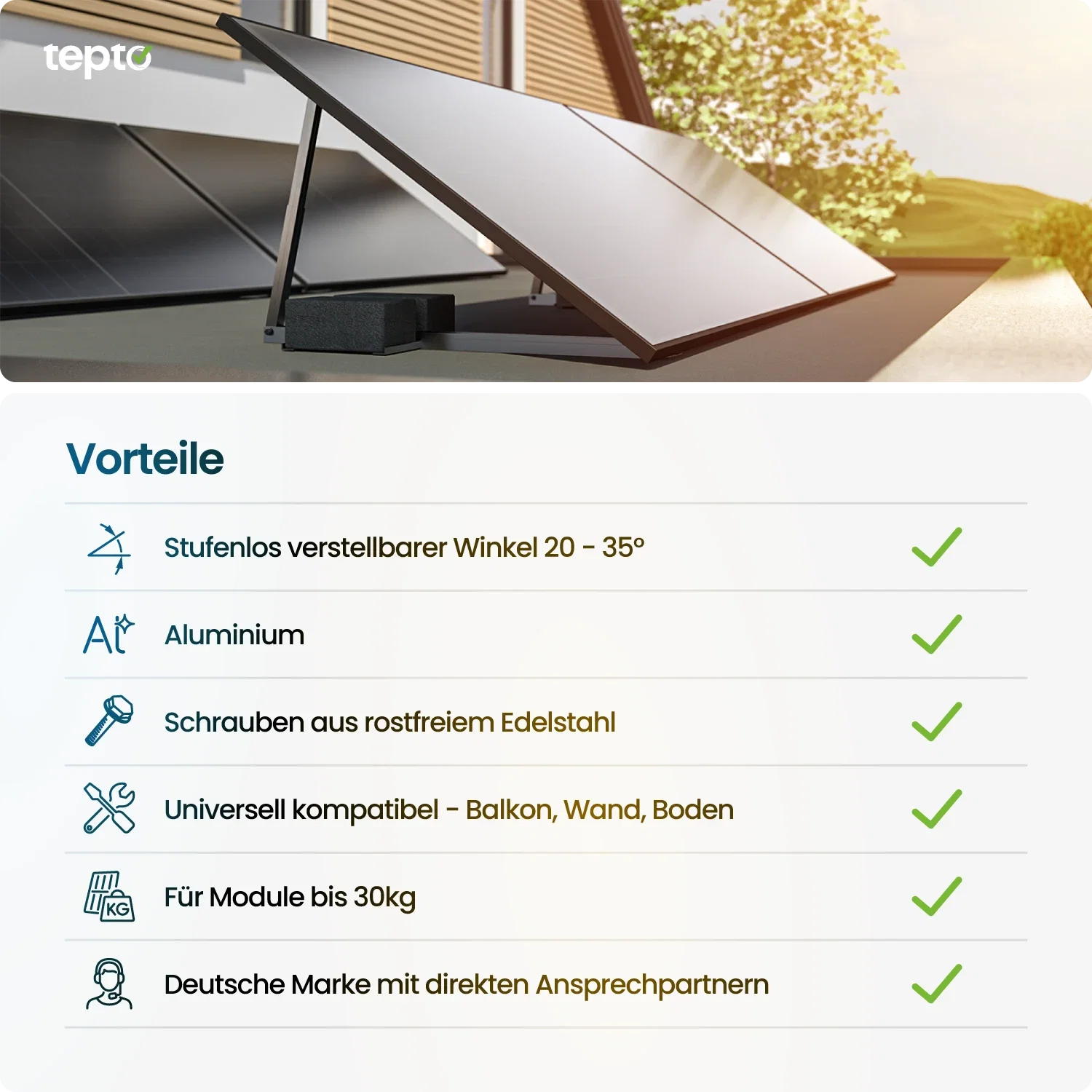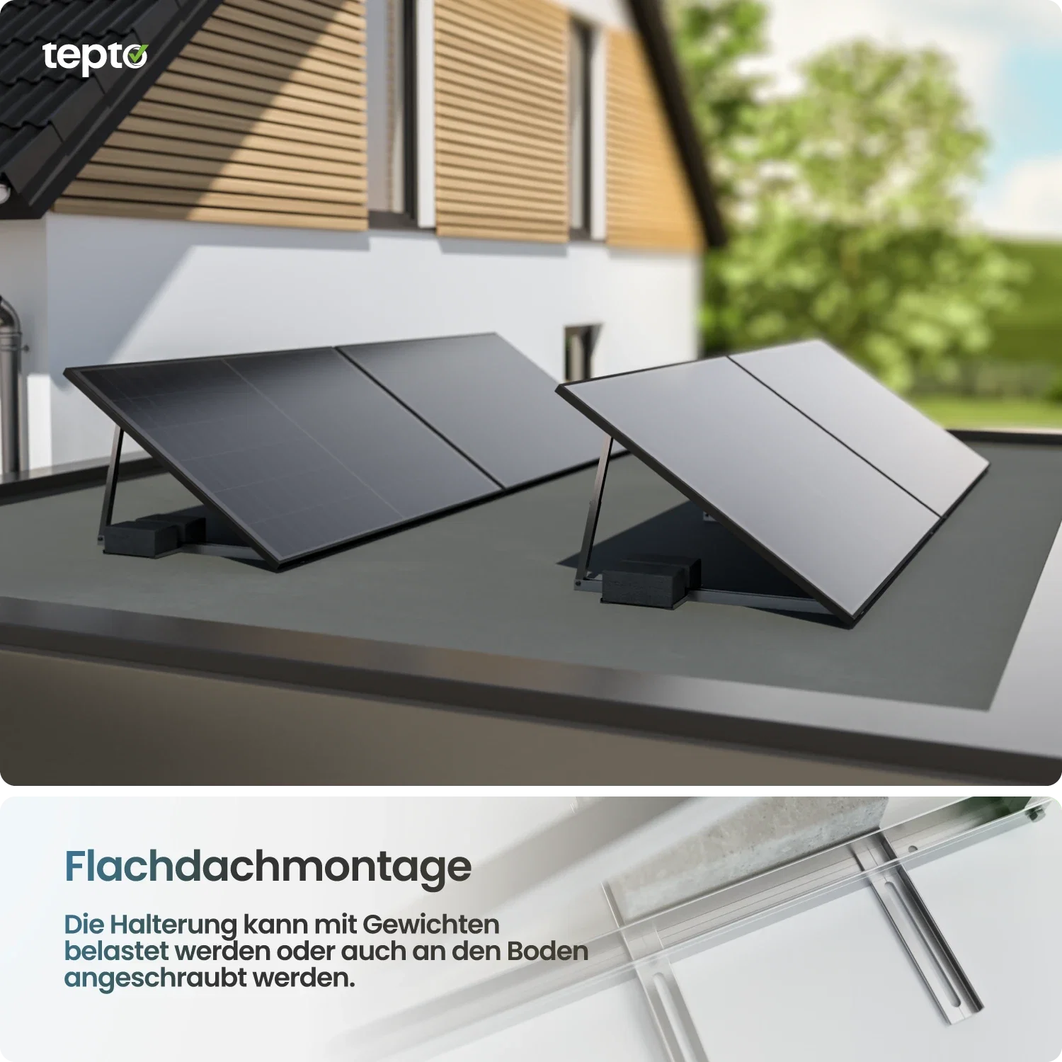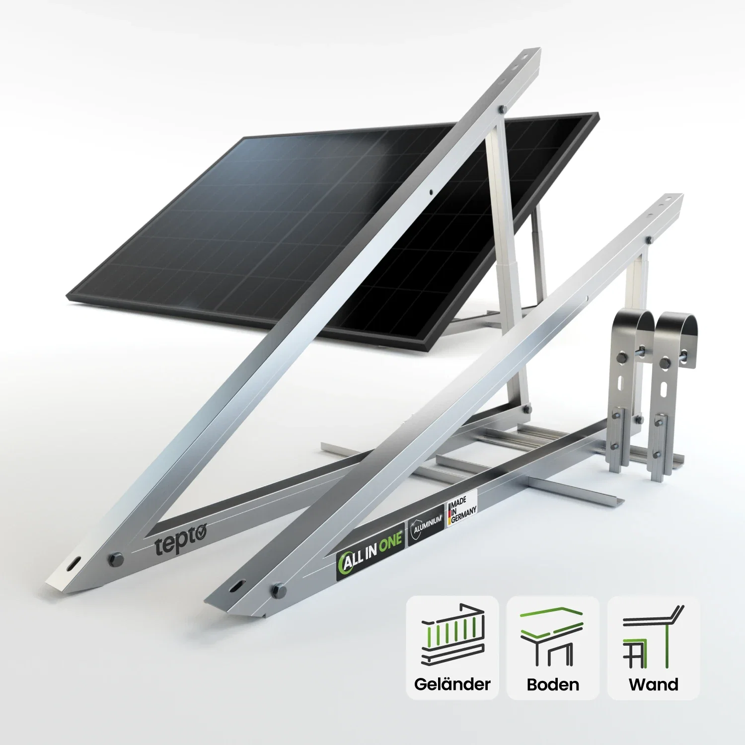 Der Neigungswinkel wird über eine integrierte Teleskopstange eingestellt. So lässt sich der Ertrag standortabhängig optimieren. Die Montage erfolgt direkt am Modulrahmen.